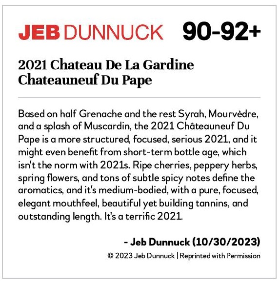 "Basé sur une moitié de Grenache et le reste de Syrah, de Mourvèdre et un soupçon de Muscardin, le 2021 Châteauneuf Du Pape est un 2021 plus structuré, plus concentré, plus sérieux et pourrait même bénéficier d'un vieillissement en bouteille à court terme, ce qui n'est pas la norme avec les 2021. Des cerises mûres, des herbes poivrées, des fleurs printanières et des tonnes de notes épicées subtiles définissent les arômes, et il est moyennement corsé, avec une sensation en bouche pure, concentrée et élégante, de beaux tanins, et une longueur exceptionnelle. C'est une formidable année 2021."